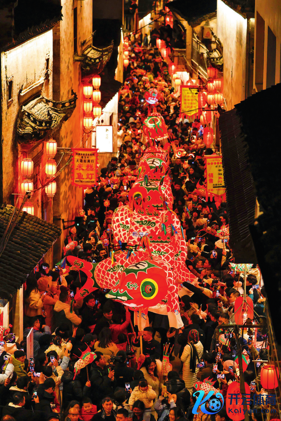 在安徽省黄山市歙县北岸镇瞻淇村,村民摆动非遗鱼灯,蛊卦了繁多旅客\n(2024 年 12 月 31 日摄) 施亚磊摄 / 本刊