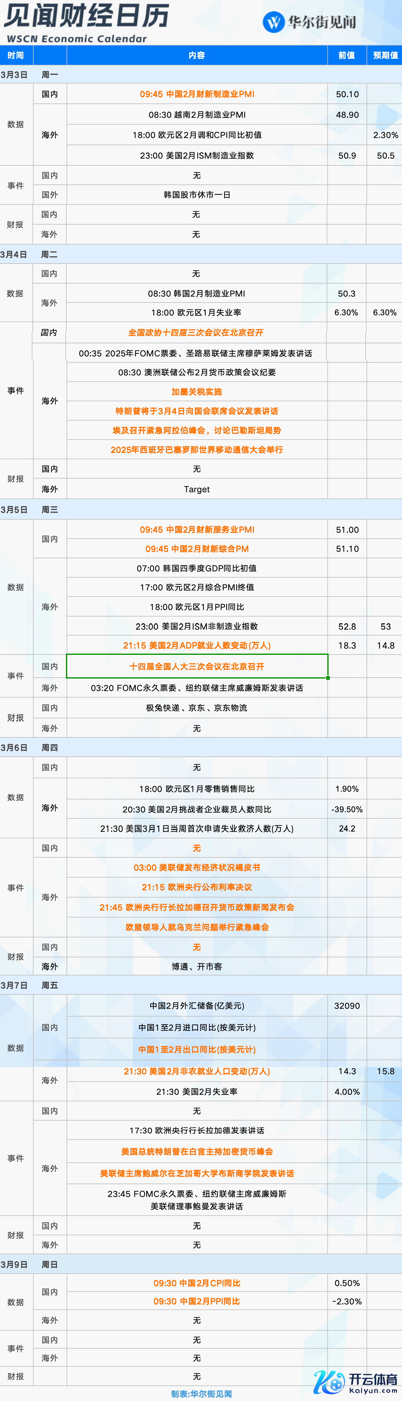 3月3日至3月9日当周重磅财经事件一览,以下均为北京时辰: