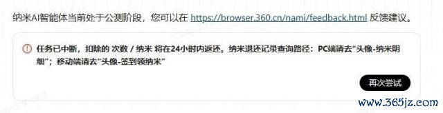 我们在测试时,也出现了一次任务报错,但纳米 AI 东谈主还怪好的,因为有些 Agent 任务出错了耗尽的 token 可不退你,而纳米 AI 是全额返还的。
