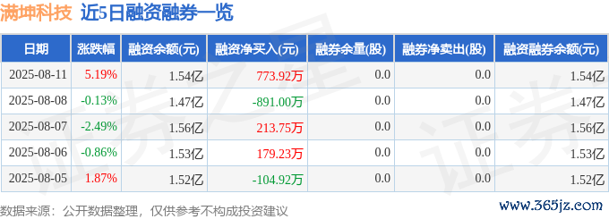 满坤科技融资融券信息表露,融资方面,当日融资买入6238.25万元,融资偿还5464.34万元,融资净买入773.92万元。融券方面,融券卖出0.0股,融券偿还0.0股,融券余量0.0股,融券余额0.0万元。融资融券余额1.54亿元。