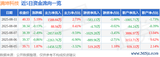 本站音尘,遏抑2025年8月11日收盘,满坤科技(301132)报收于40.33元,高潮5.19%,换手率9.95%,成交量14.73万手,成交额5.83亿元。