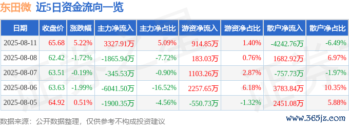 本站音信,散伙2025年8月11日收盘,东田微(301183)报收于65.68元,上升5.22%,换手率17.11%,成交量10.03万手,成交额6.54亿元。