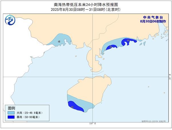 降水预告:30日8时至31日8时,广东西南部沿海、广西南部沿海、海南岛南部有大到暴雨(50~90毫米)。